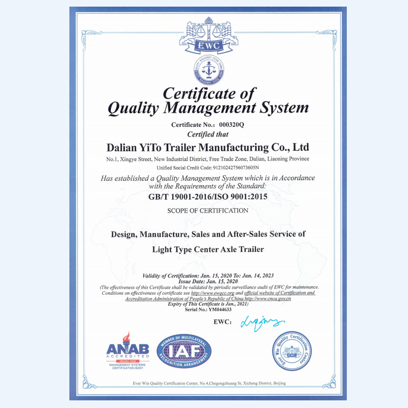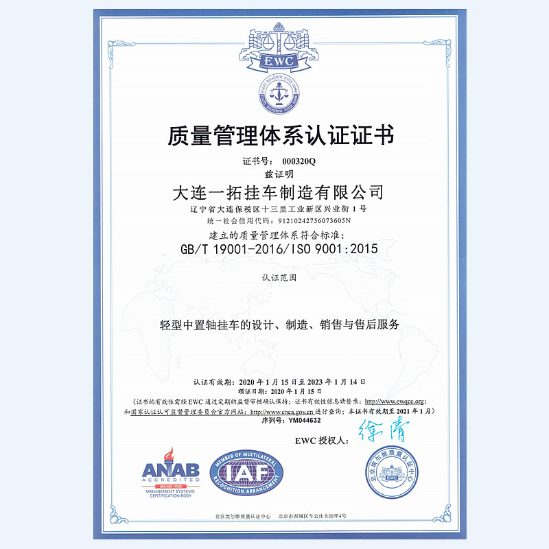 大連一拓掛車制造有限公司,地處遼寧省大連保稅區(qū)十三里工業(yè)新區(qū)興業(yè)街1號,公司占地45000m㎡,總建筑面積24000㎡,現(xiàn)有生產(chǎn)、檢測、研發(fā)設(shè)備100余臺套,擁有自動化程度很高的機(jī)器人焊接生產(chǎn)線。大連一拓掛車制造有限公司成立于2013年,是一家具備國家工信部專用車生產(chǎn)資質(zhì)企業(yè),致力于乘用車掛車的設(shè)計和生產(chǎn),主要產(chǎn)品有:平板板式輕型中置軸掛車、欄板式輕型中置軸掛車、廂式輕型中置軸掛車、特種結(jié)構(gòu)式輕型中置軸掛車,并承接各種用途輕型中置軸掛車設(shè)計等業(yè)務(wù)。公司秉承“銳意進(jìn)取,開拓創(chuàng)新,精益求精,誠信共贏”的運(yùn)營理念,竭誠為您服務(wù)。